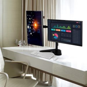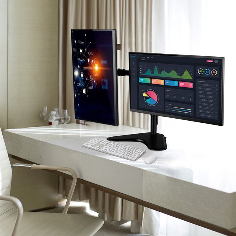 Se puede colocar un monitor en modo horizontal y otro en forma vertical, fácil instalación, con organizador de cables para mantenerlos ocultos y ordenados.