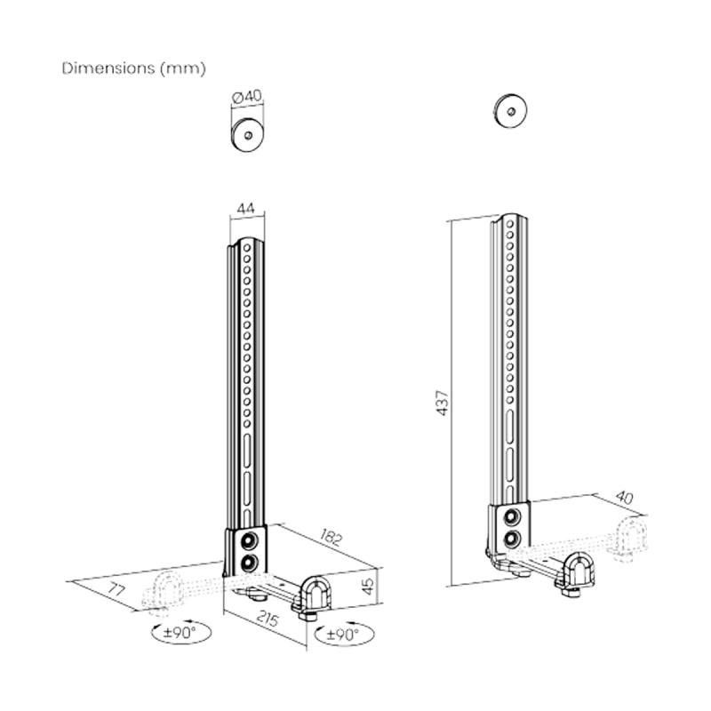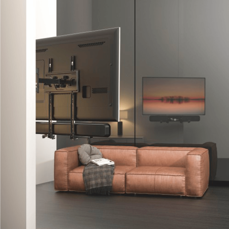 Soportes ajustables: Se adaptan a la barra de sonido de 40 - 182 mm de profundidad, proporcionando un agarre fuerte y asegurando que la barra de sonido no se vuelque cuando el soporte se inclina 10°.
